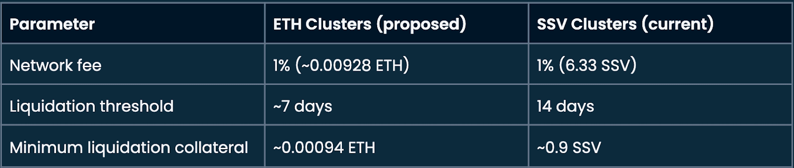 The transition to ETH payments introduces a new liquidation framework specifically for ETH-denominated clusters.Because network fees, collateral, and liquidation execution are all denominated in ETH, the overall risk profile is materially lower than under the SSV-based model. This allows liquidation parameters to be significantly more capital-efficient while maintaining safety.